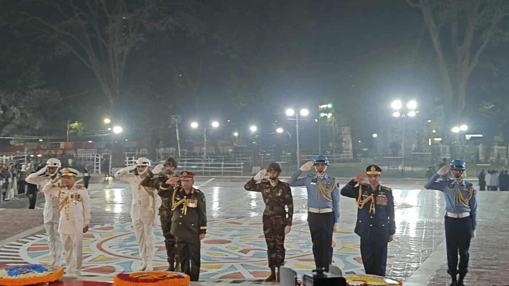 এরপর যথাক্রমে তিনবাহিনীর সেনা বাহিনী প্রধান জেনারেল ওয়াকার-উজ -জামান, নৌ বাহিনী প্রধান এডমিরাল মোহাম্মদ নাজমুল হাসান ও বিমান বাহিনী প্রধান এয়ার চিফ মার্শাল হাসান মাহমুদ খাঁন পুস্পস্তবক অর্পণ করেন।